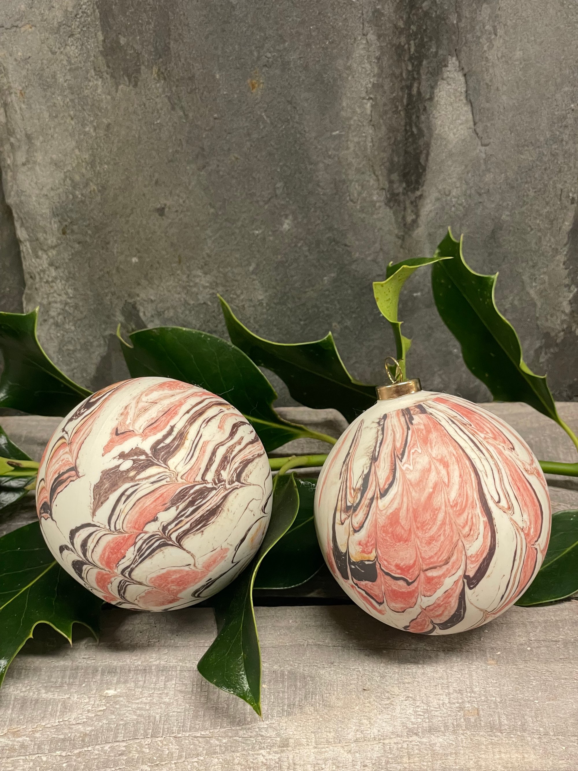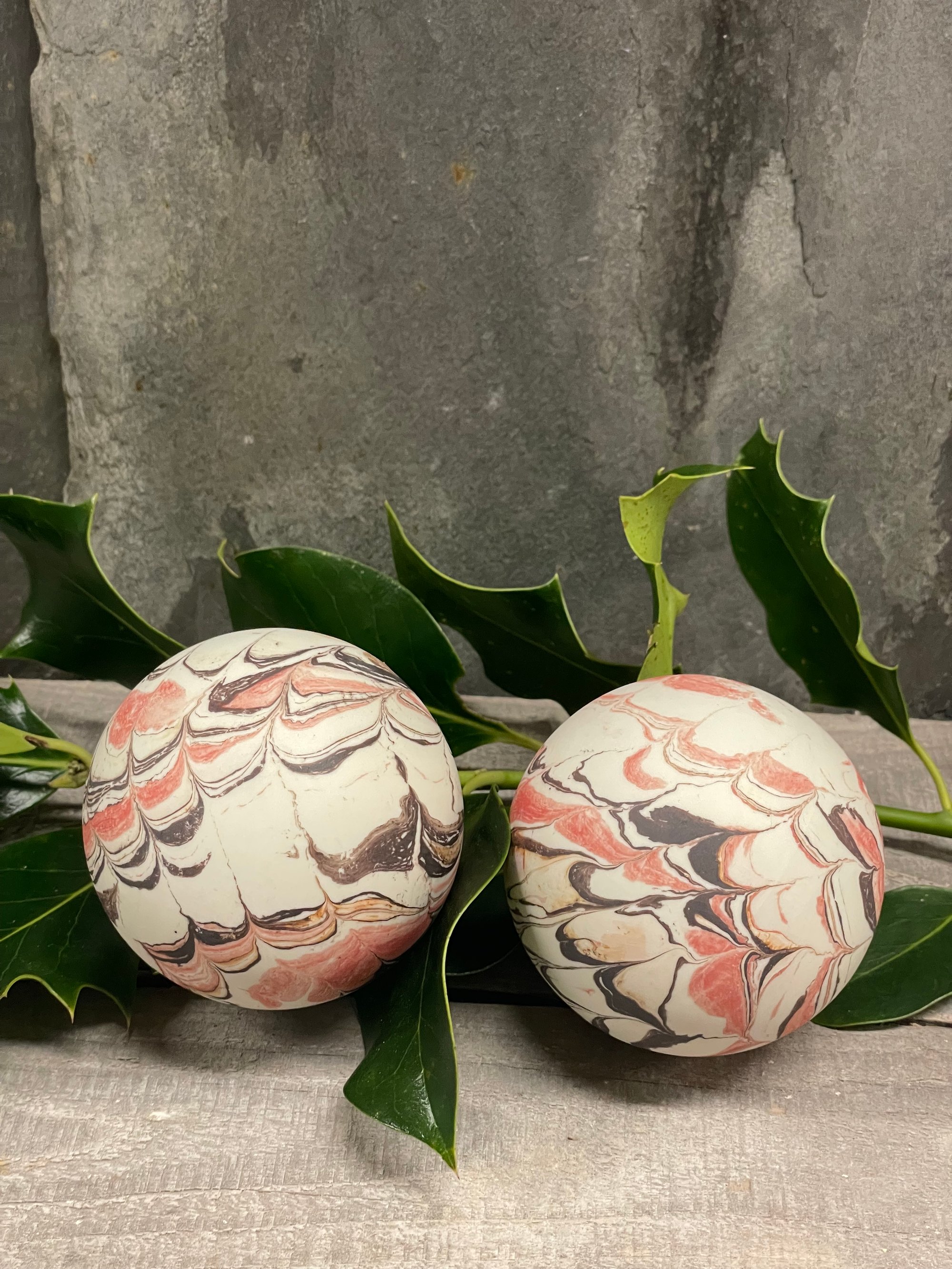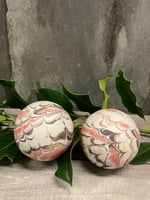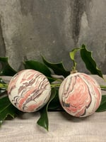 Et sæt med 2 marmorerede julekugler. Jule kuglerne er støbt i porcelæn.