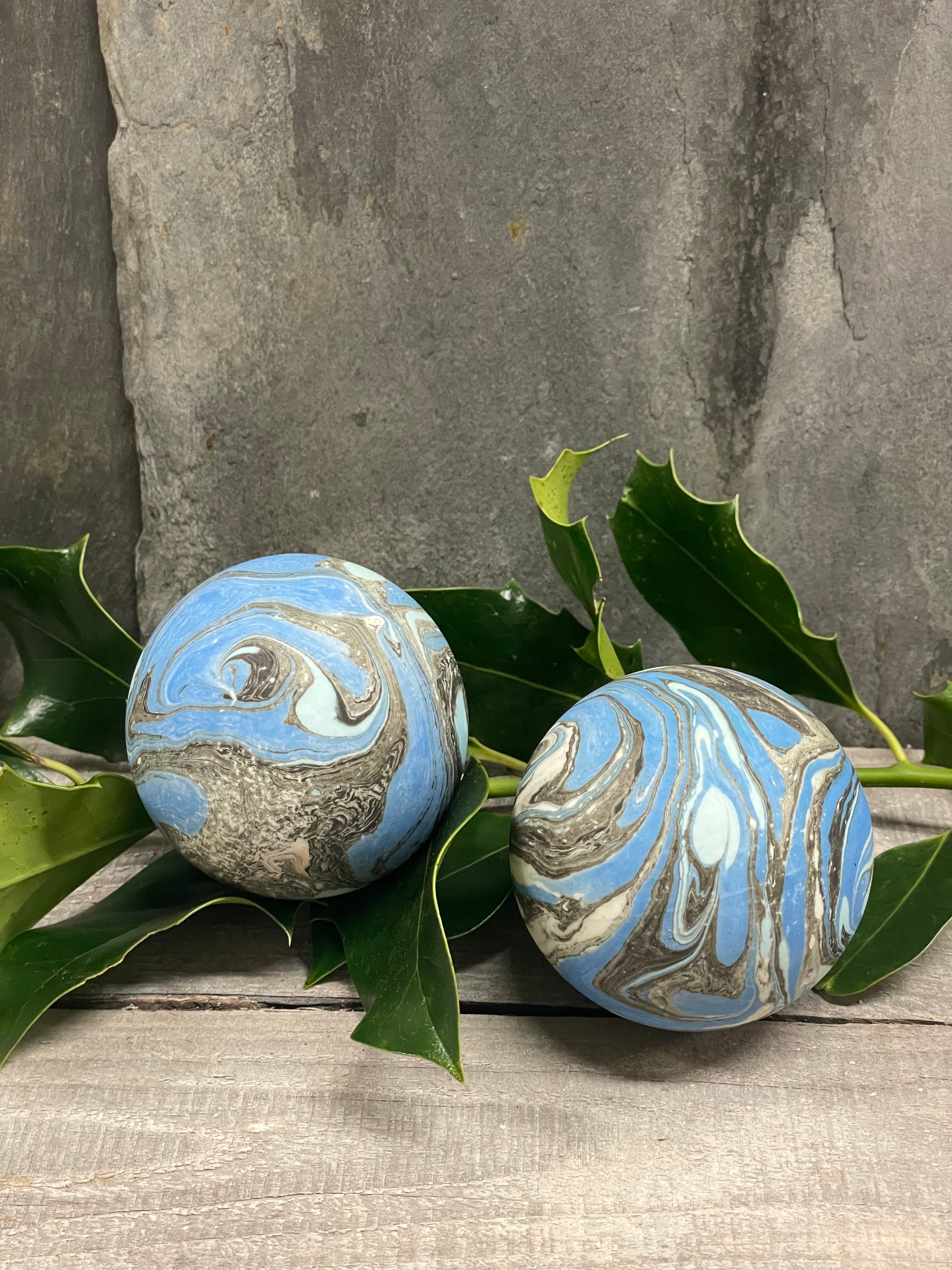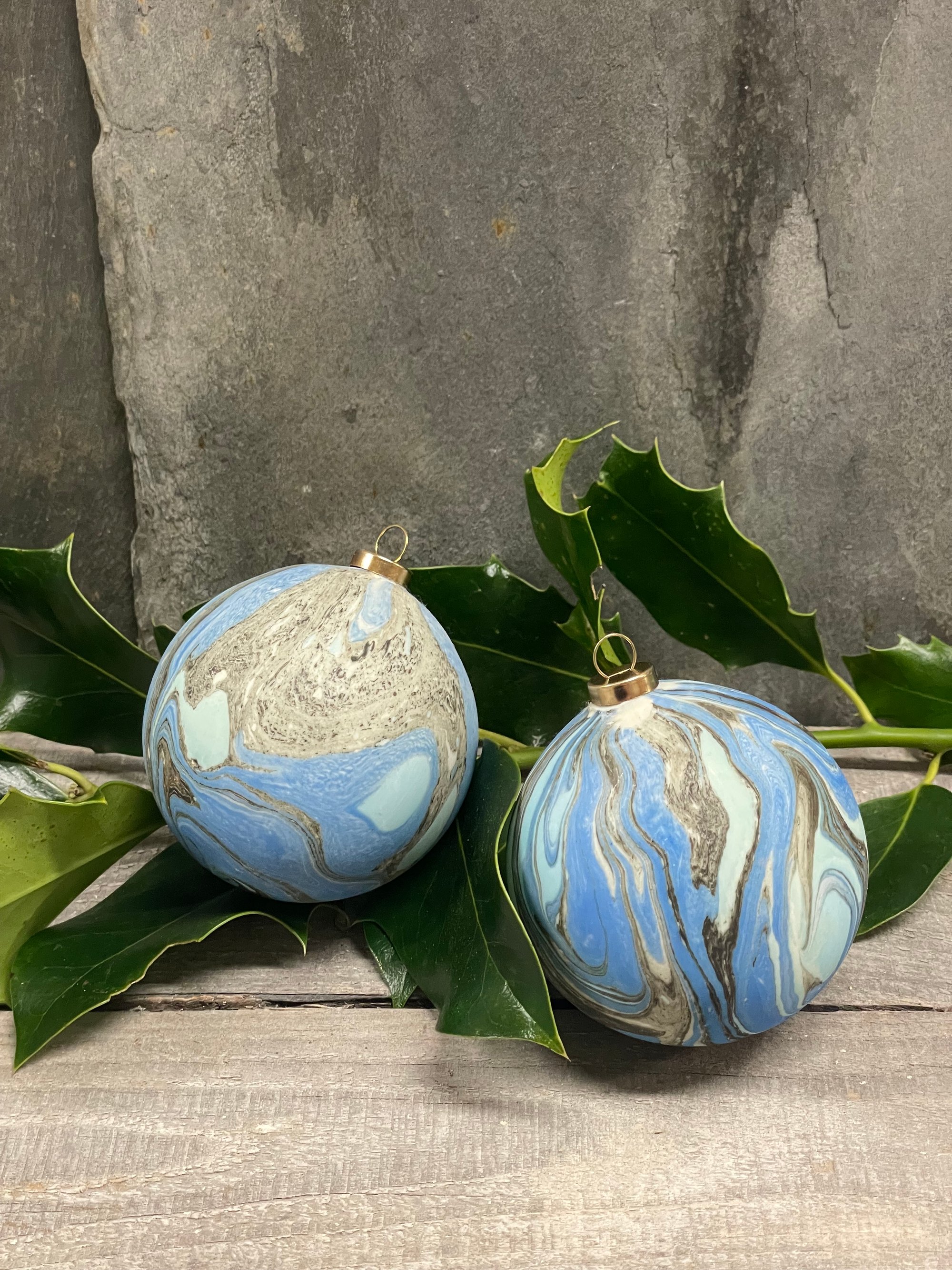 Et sæt med 2 marmorerede julekugler. Jule kuglerne er støbt i porcelæn.