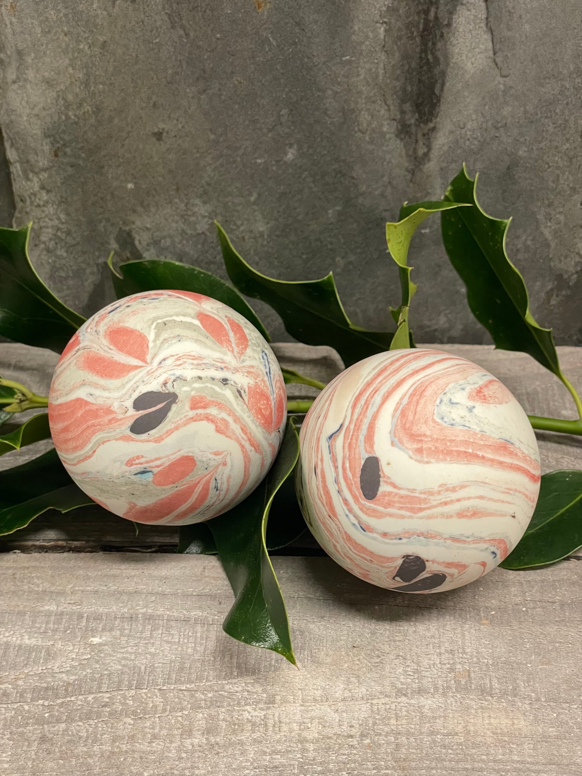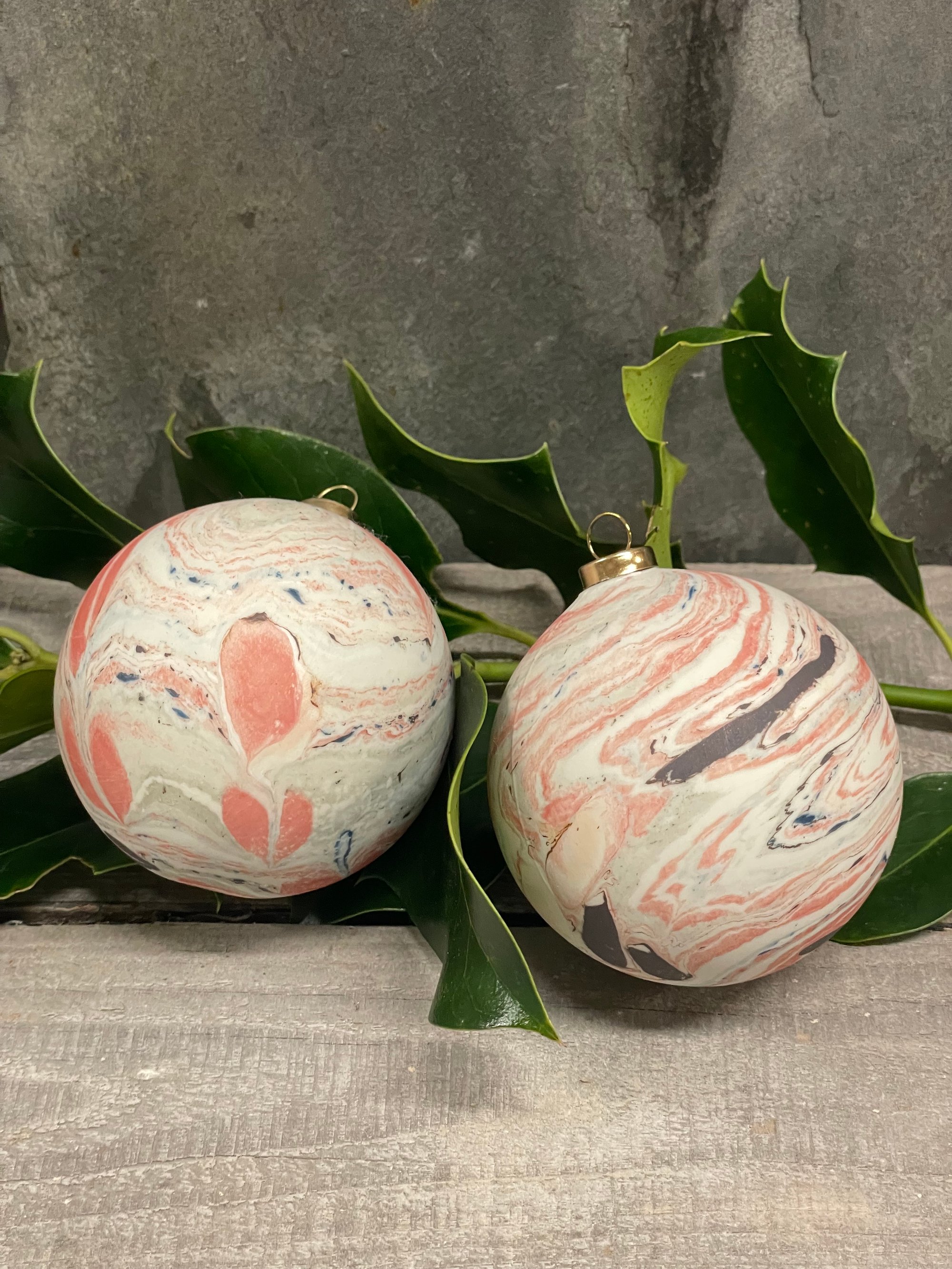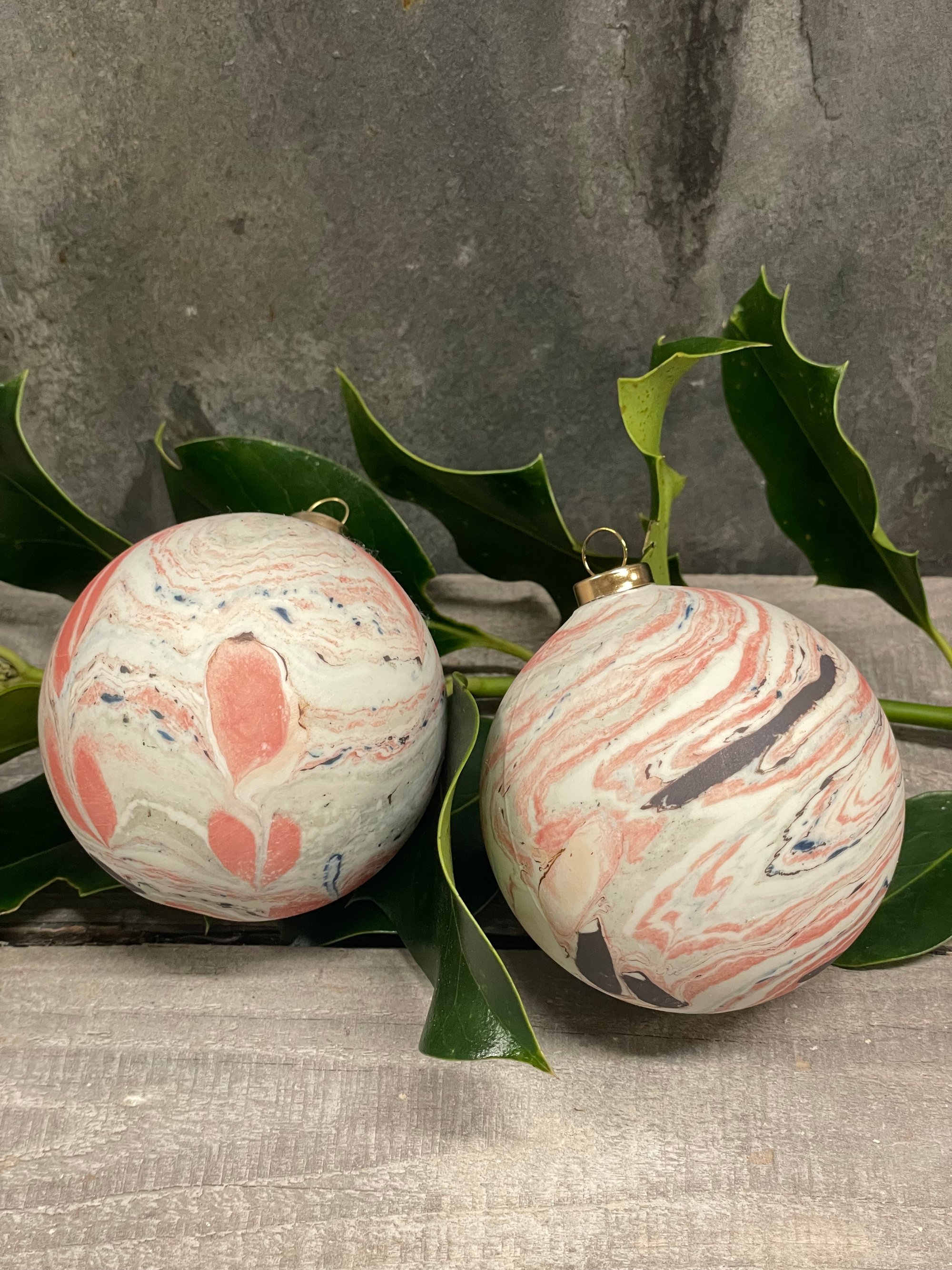 Et sæt med 2 marmorerede julekugler. Jule kuglerne er støbt i porcelæn.