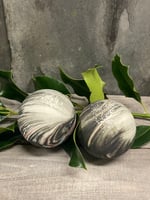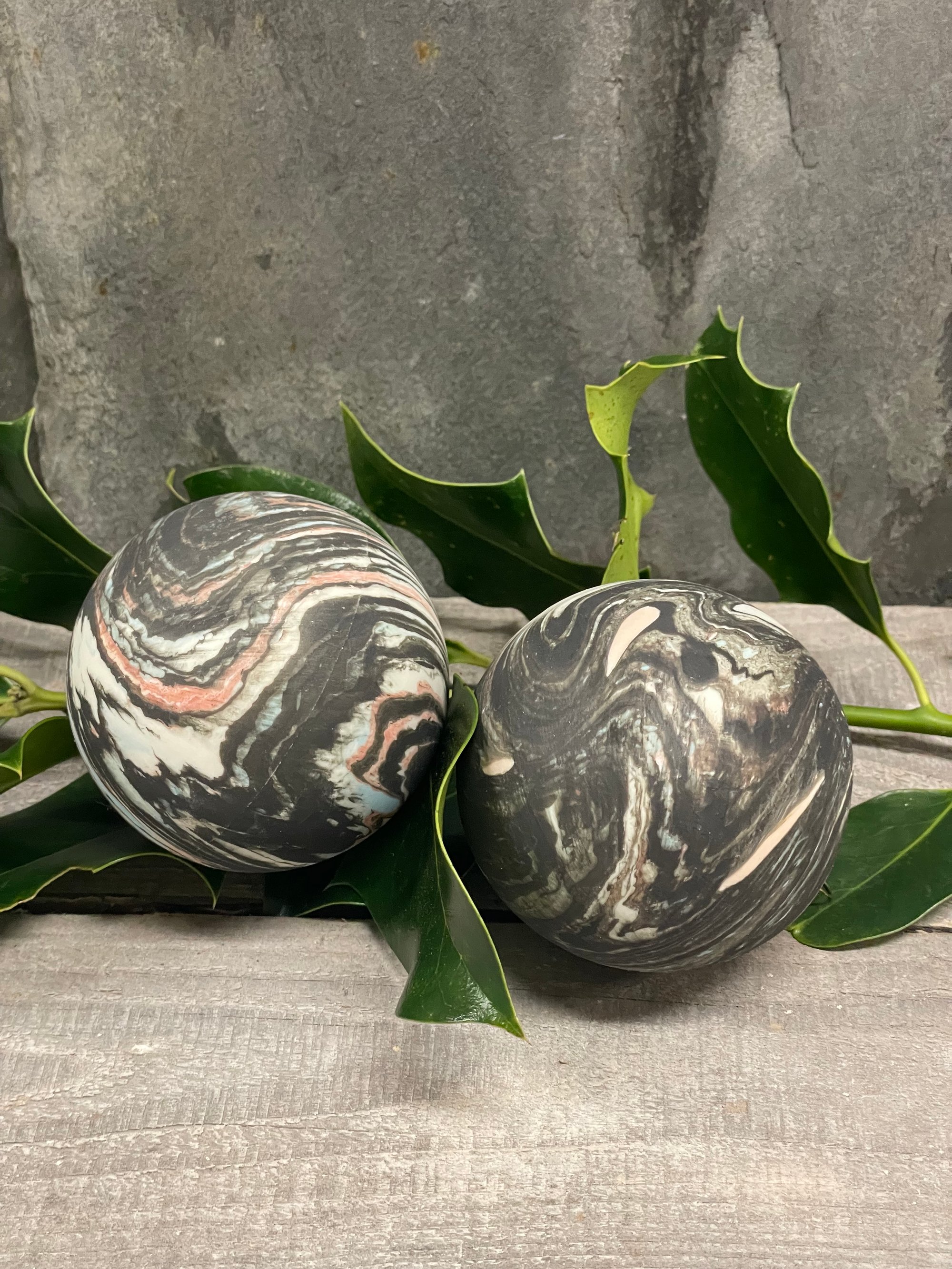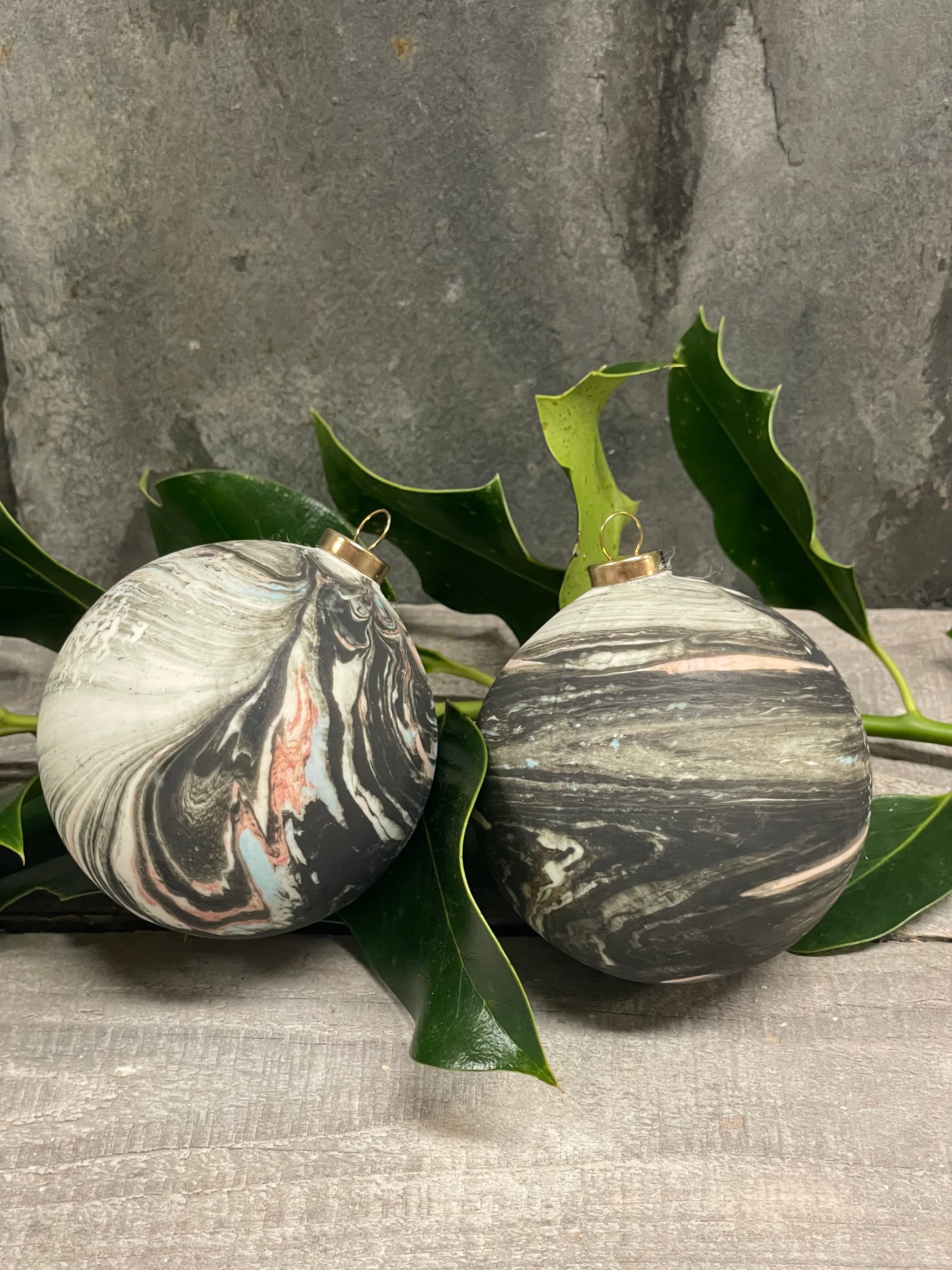 Et sæt med 2 marmorerede julekugler. Jule kuglerne er støbt i porcelæn.