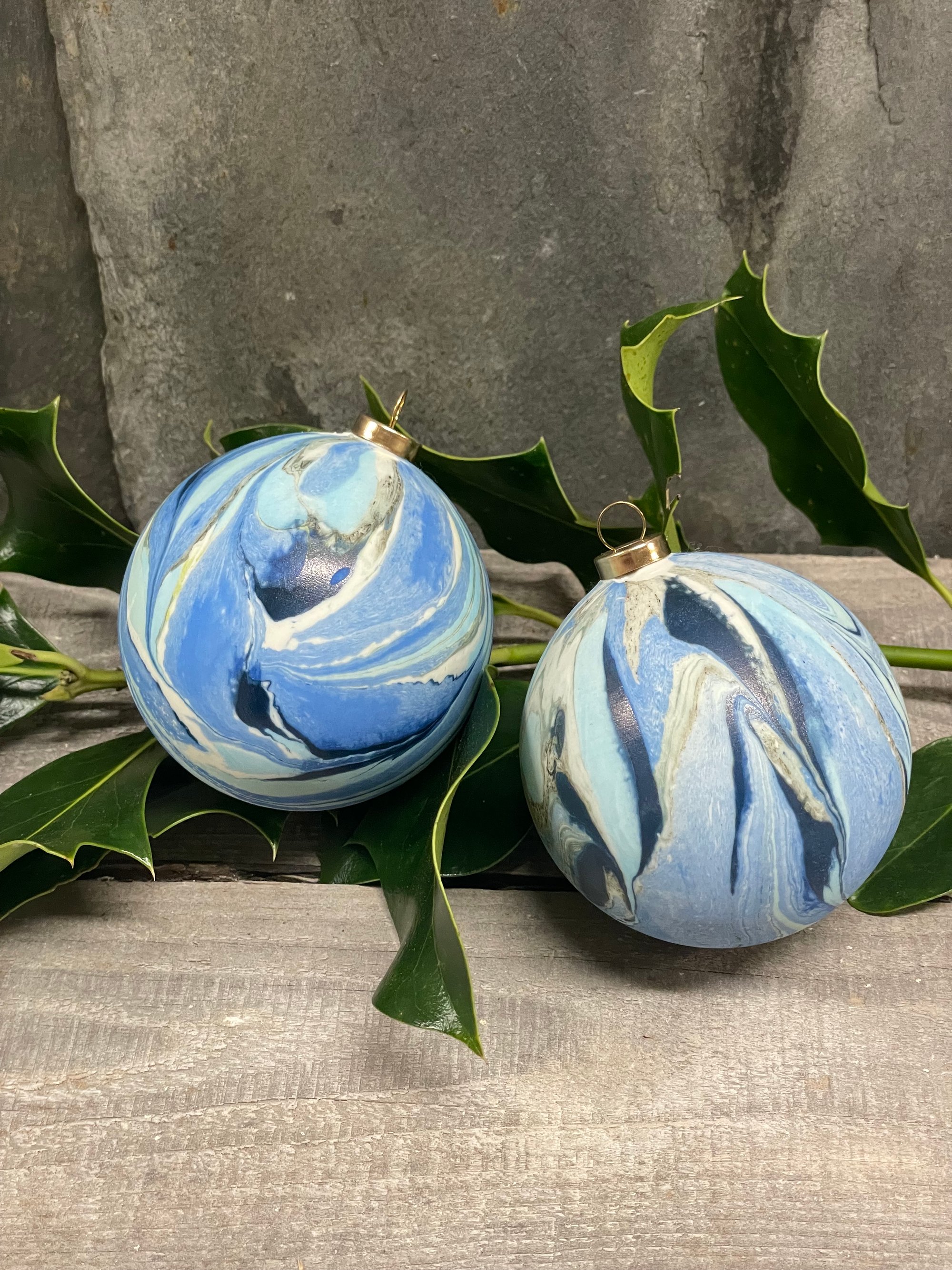 Et sæt med 2 marmorerede julekugler. Jule kuglerne er støbt i porcelæn.
