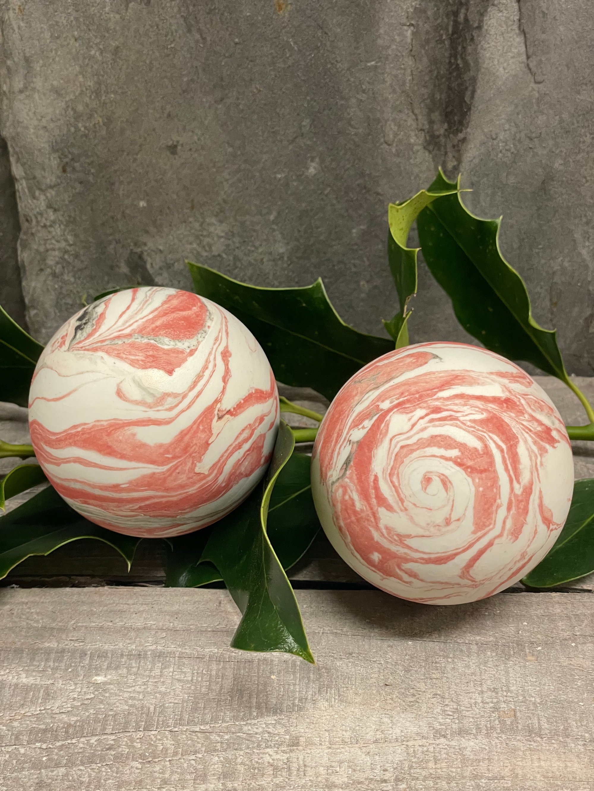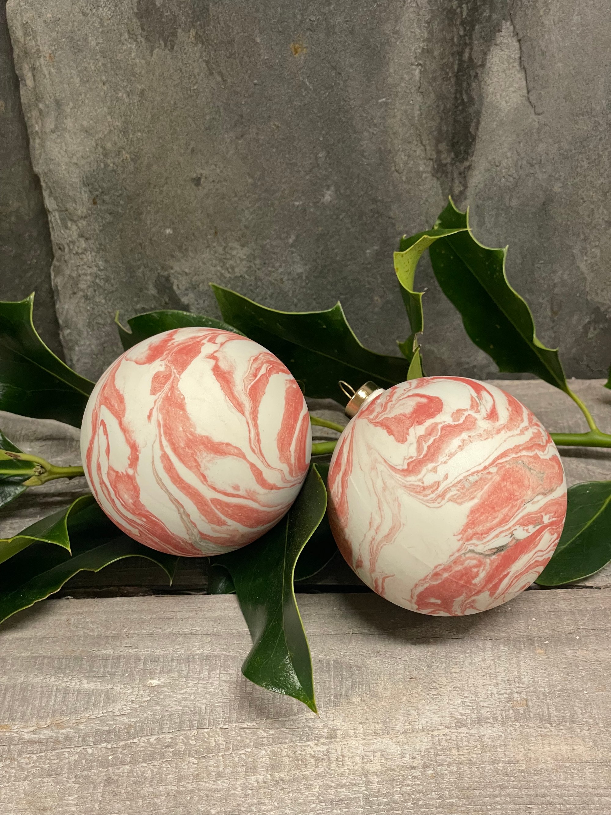 Et sæt med 2 marmorerede julekugler. Jule kuglerne er støbt i porcelæn.